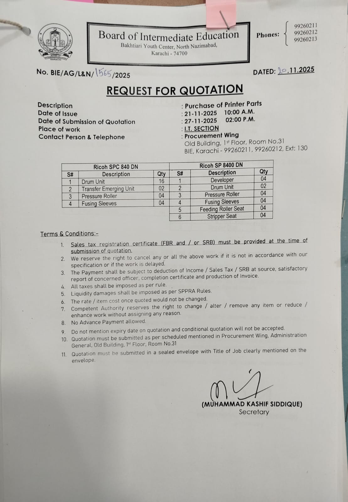 Request for Quotations for the purchase of Printer Parts (20-11-2025)
