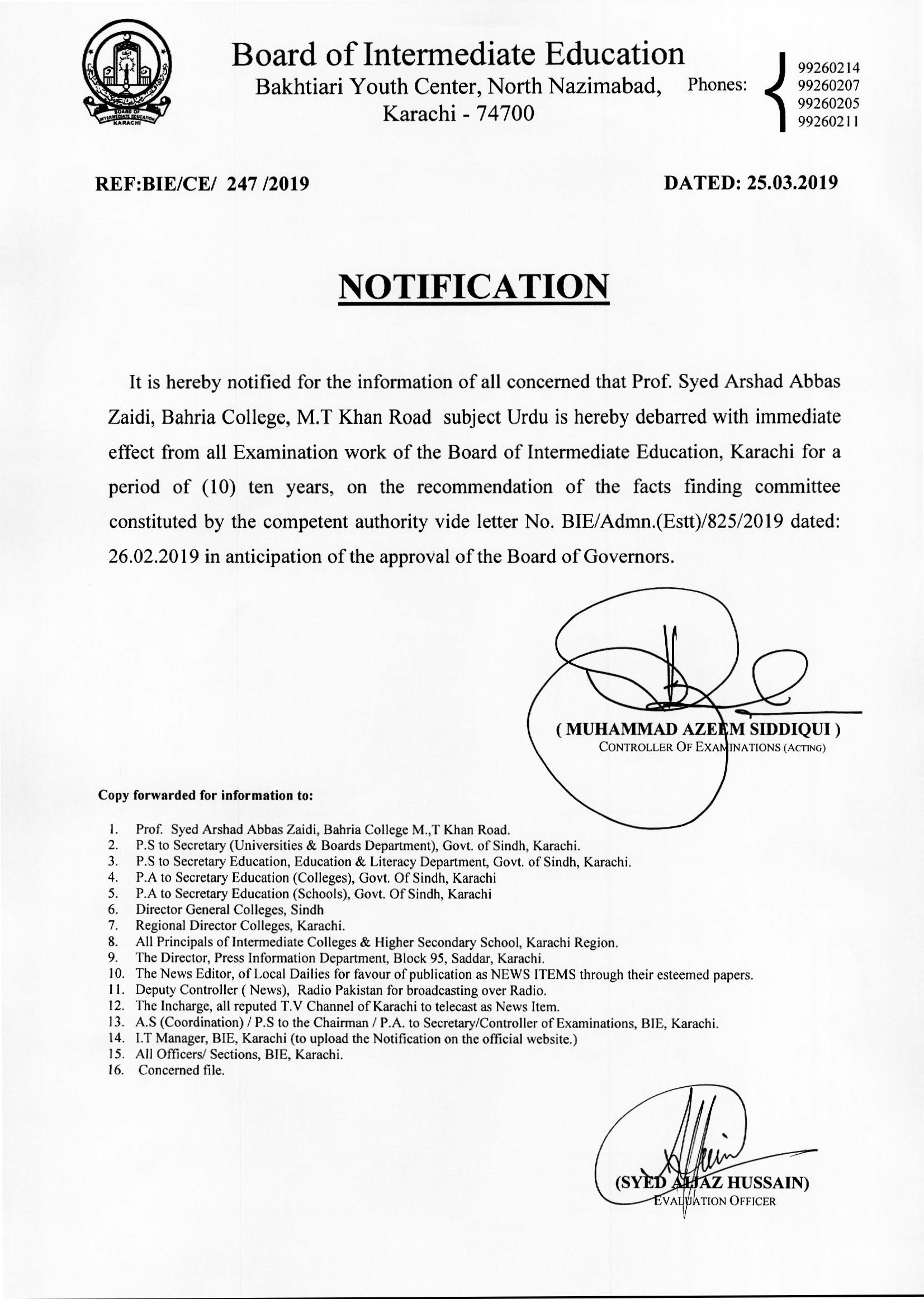 Notification regarding Chairman Board of Intermediate Education, Karachi