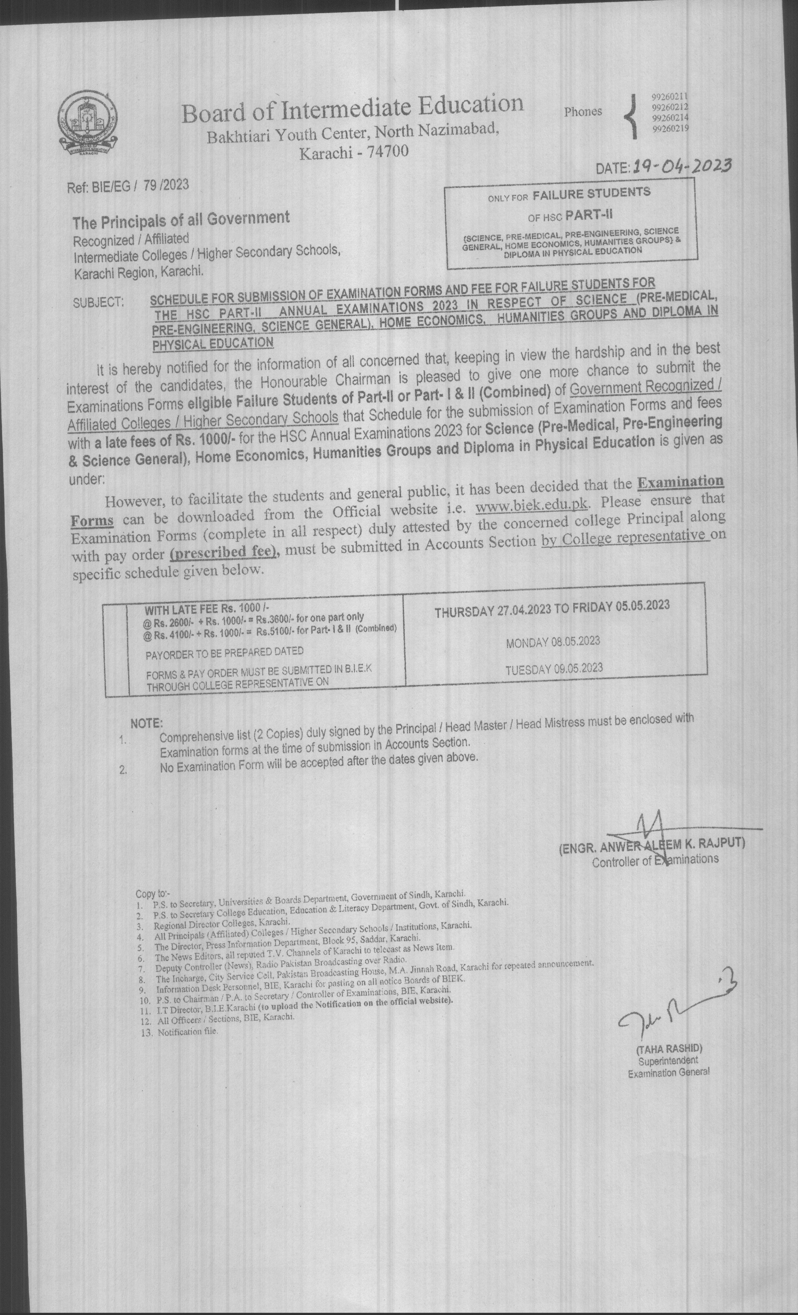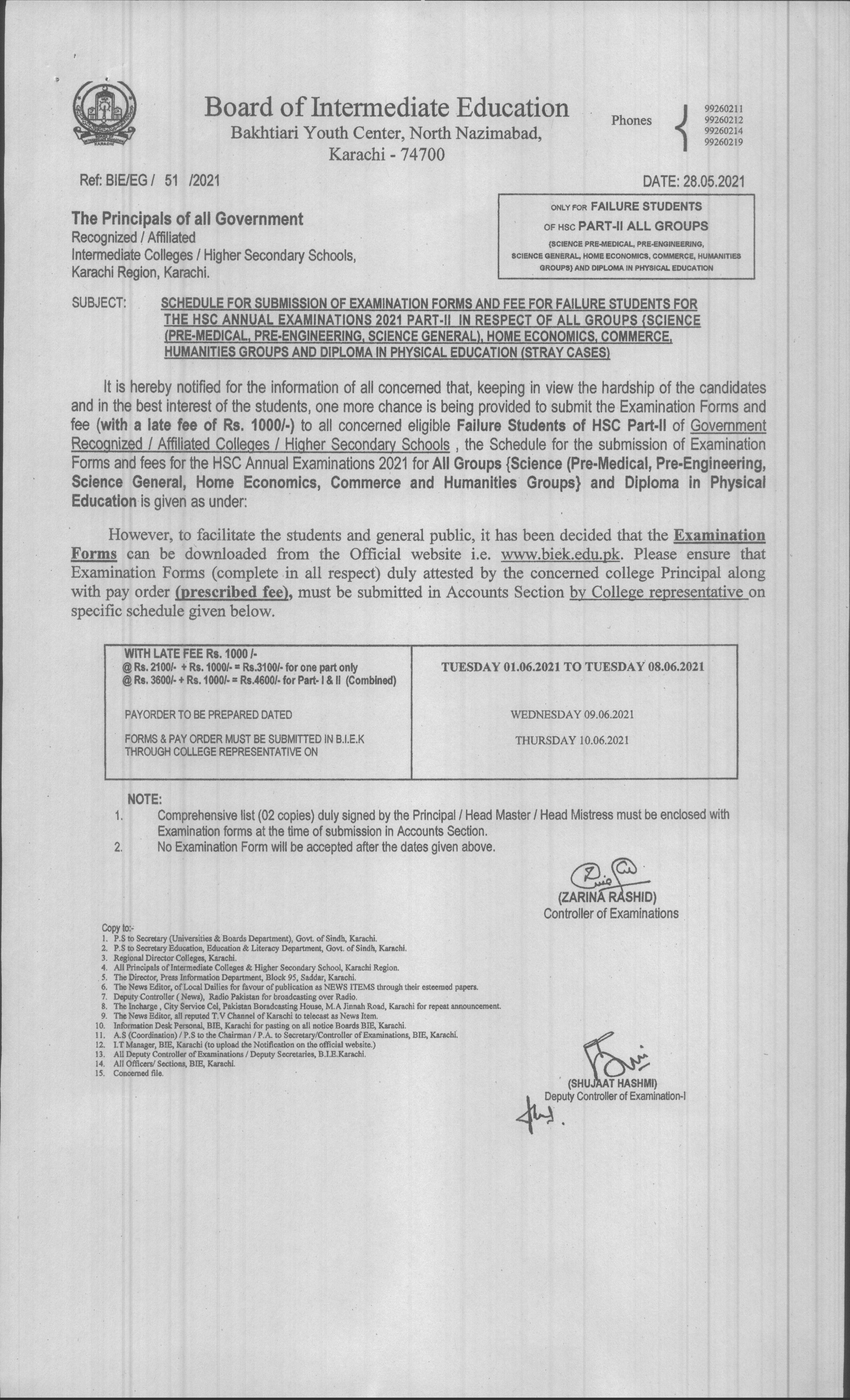 Schedule for Submission of Examination forms and fee for the failure students for the HSC Part-II and repeaters of Part-I Annual Examinations 2024 in respect of Science and Home Economics Groups Stray cases