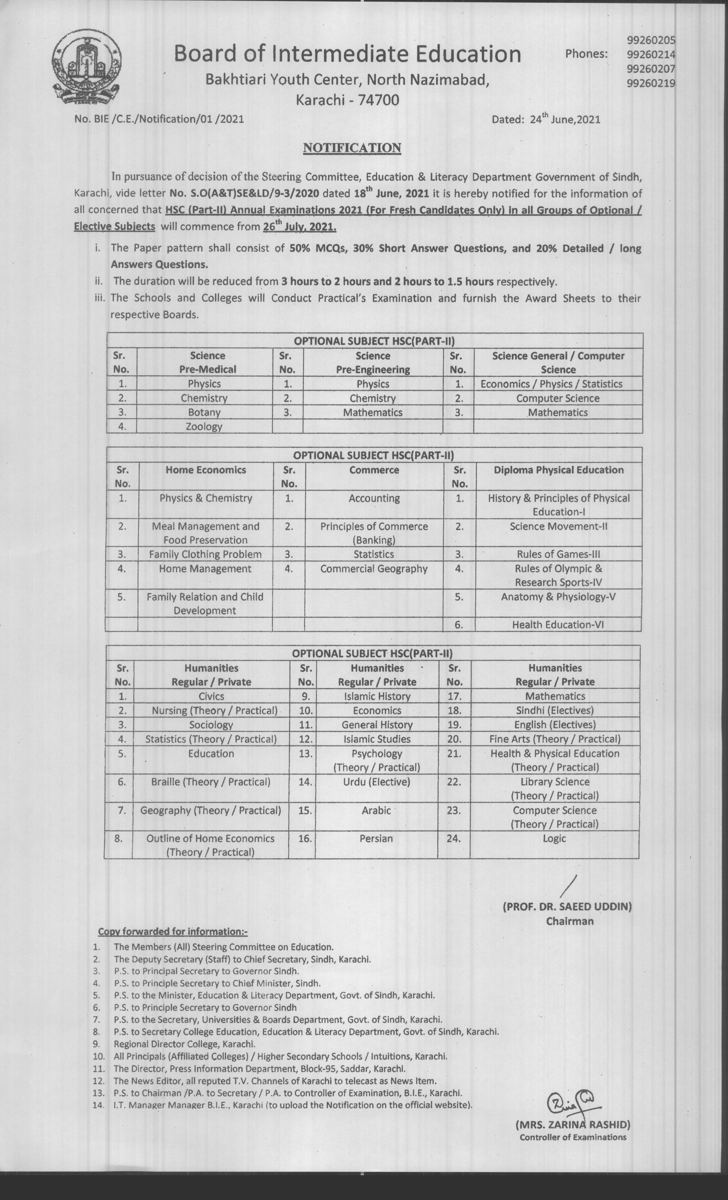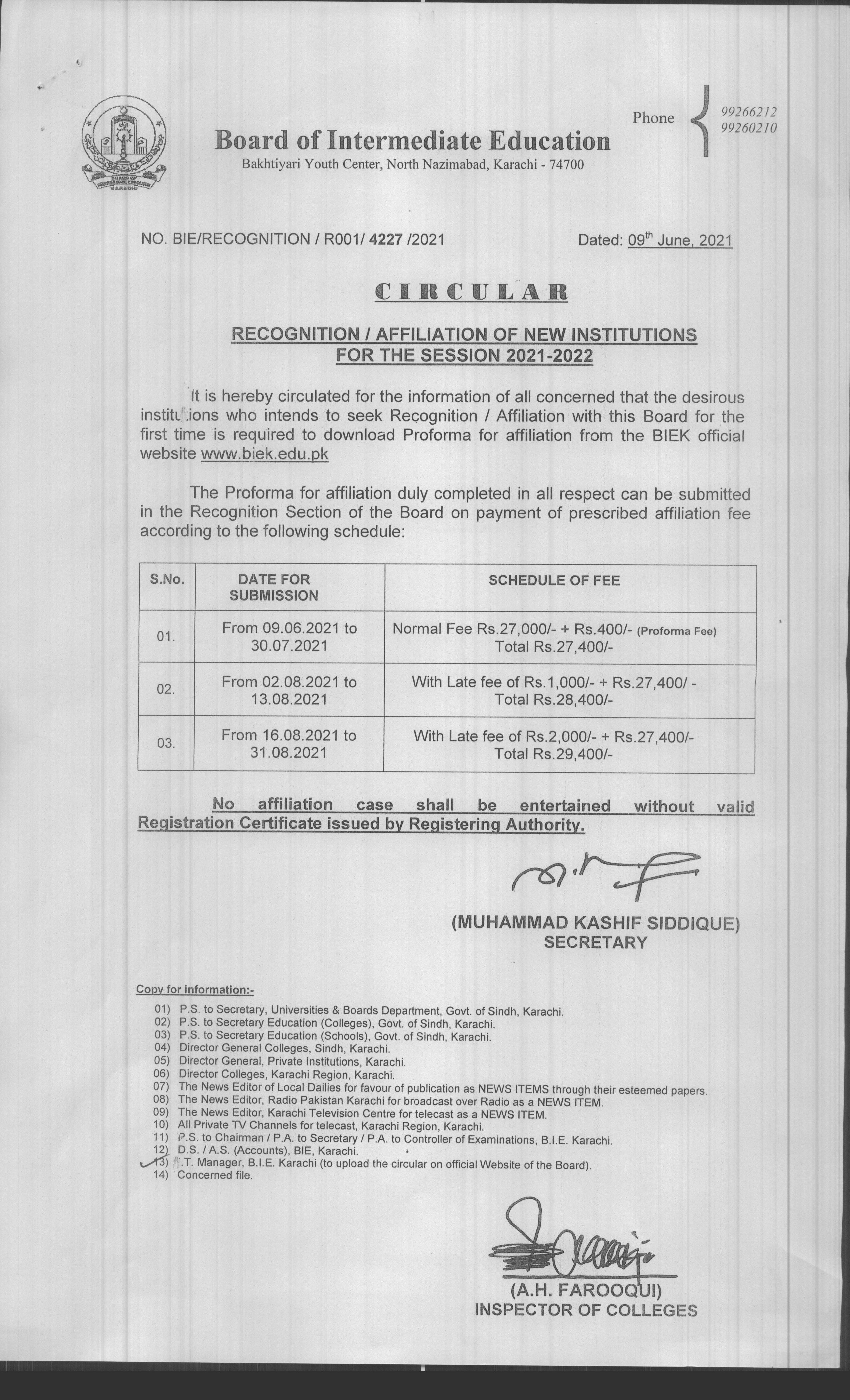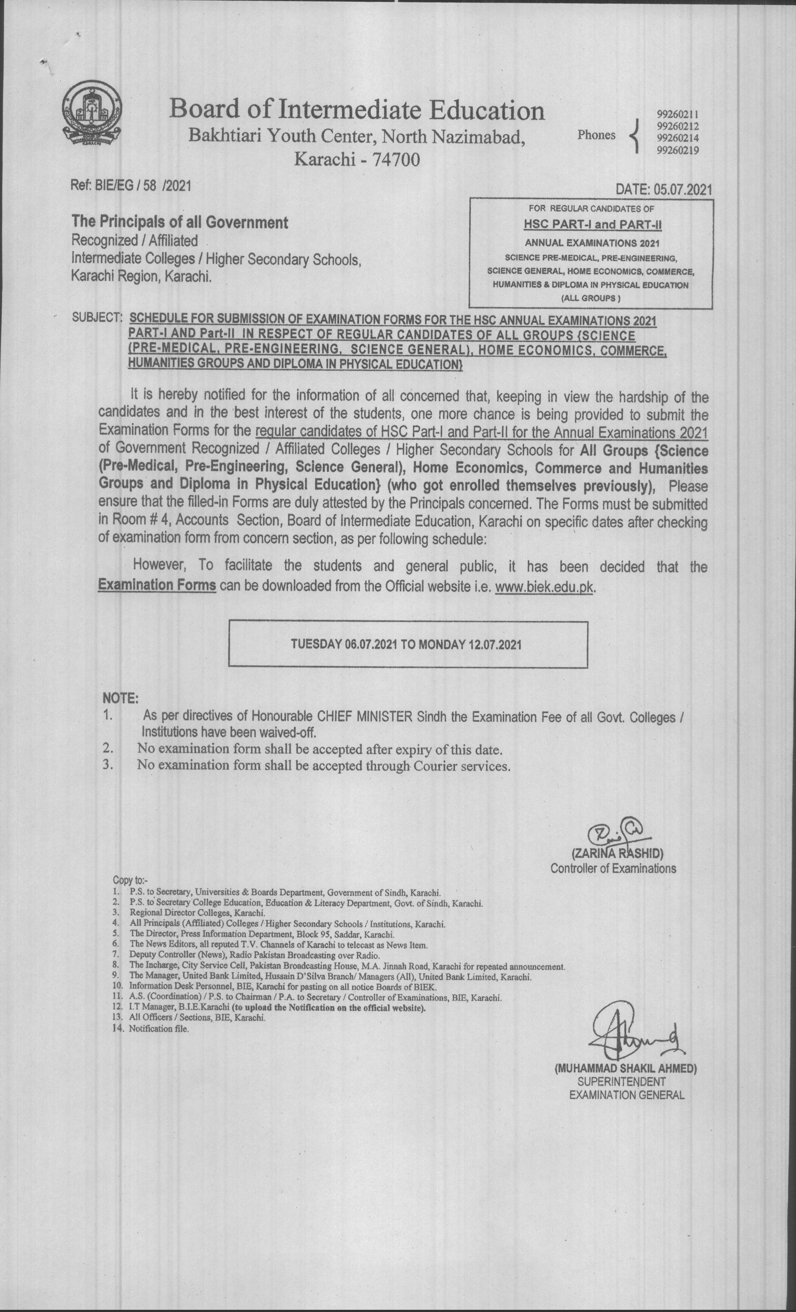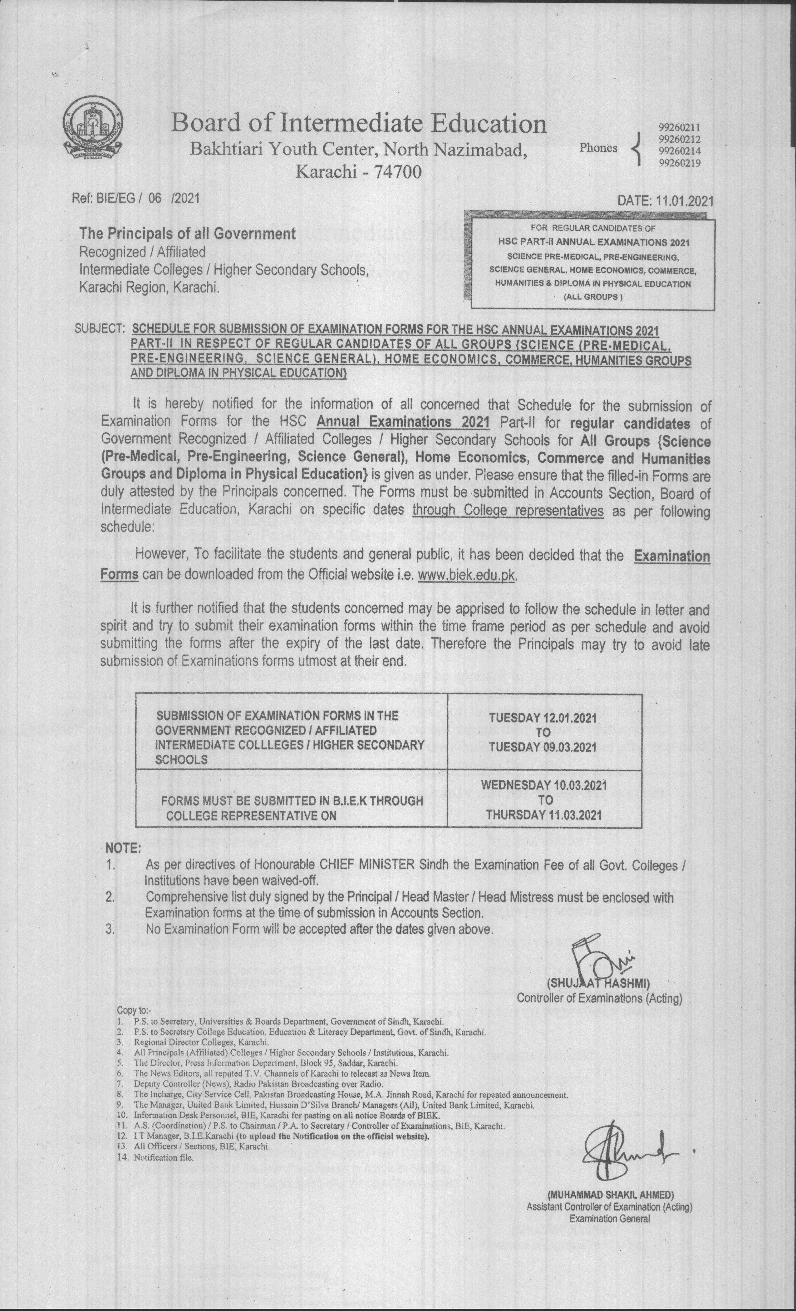 (The Principals of All Private Colleges) Schedule for Submission of Examination Forms forms for the HSC PART-I (Fresh) Annual Examinations 2022 In respect of Science (Pre-Medical, Pre-Engineering & Science General. Commerce, Humanities and Medical Technology Groups