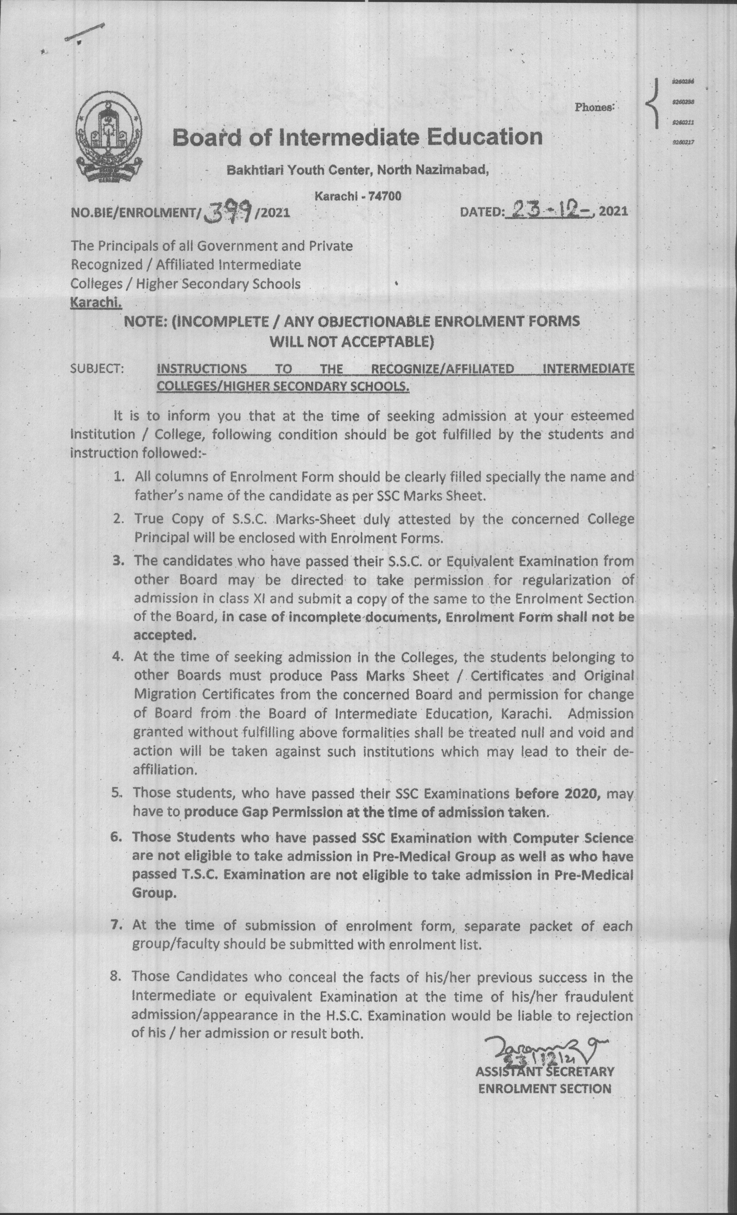 Dated: 01 Mar 2022 Circulars No.BIE/Enrollment/424/2022 BIE/ENROLMENT/424/2022