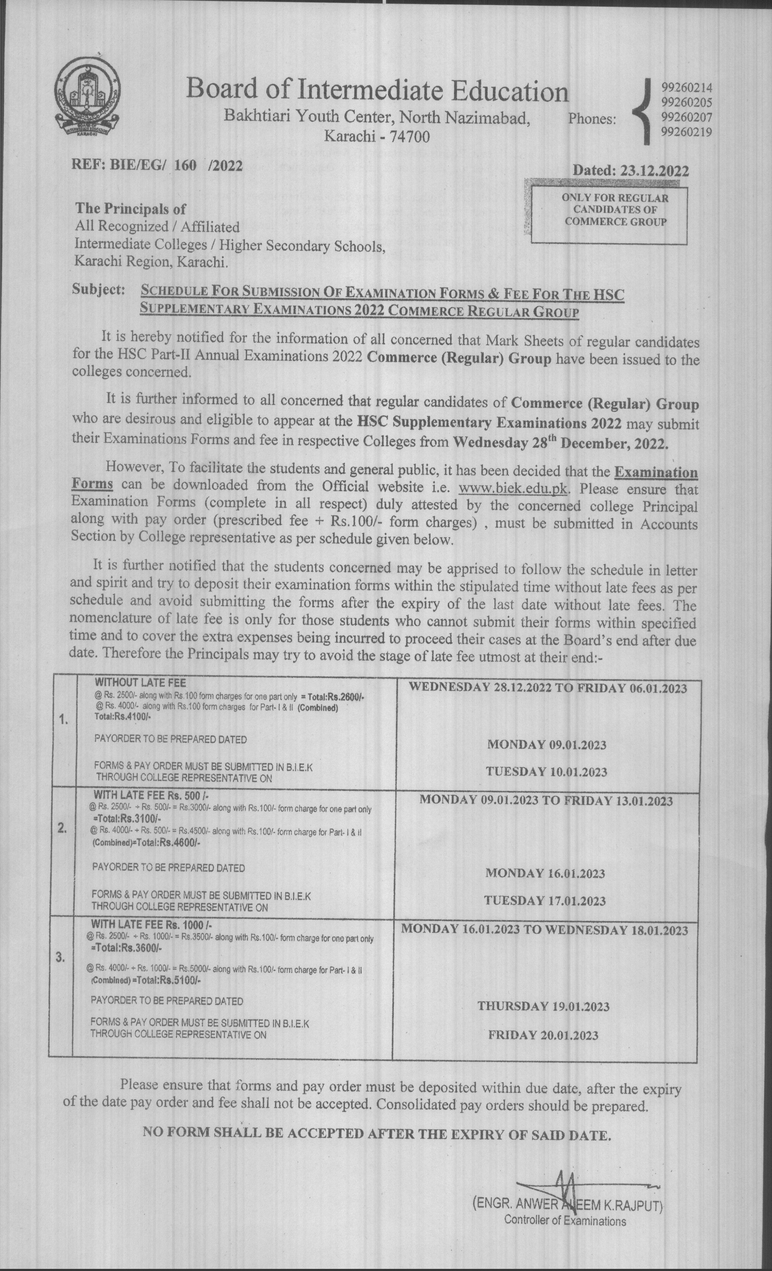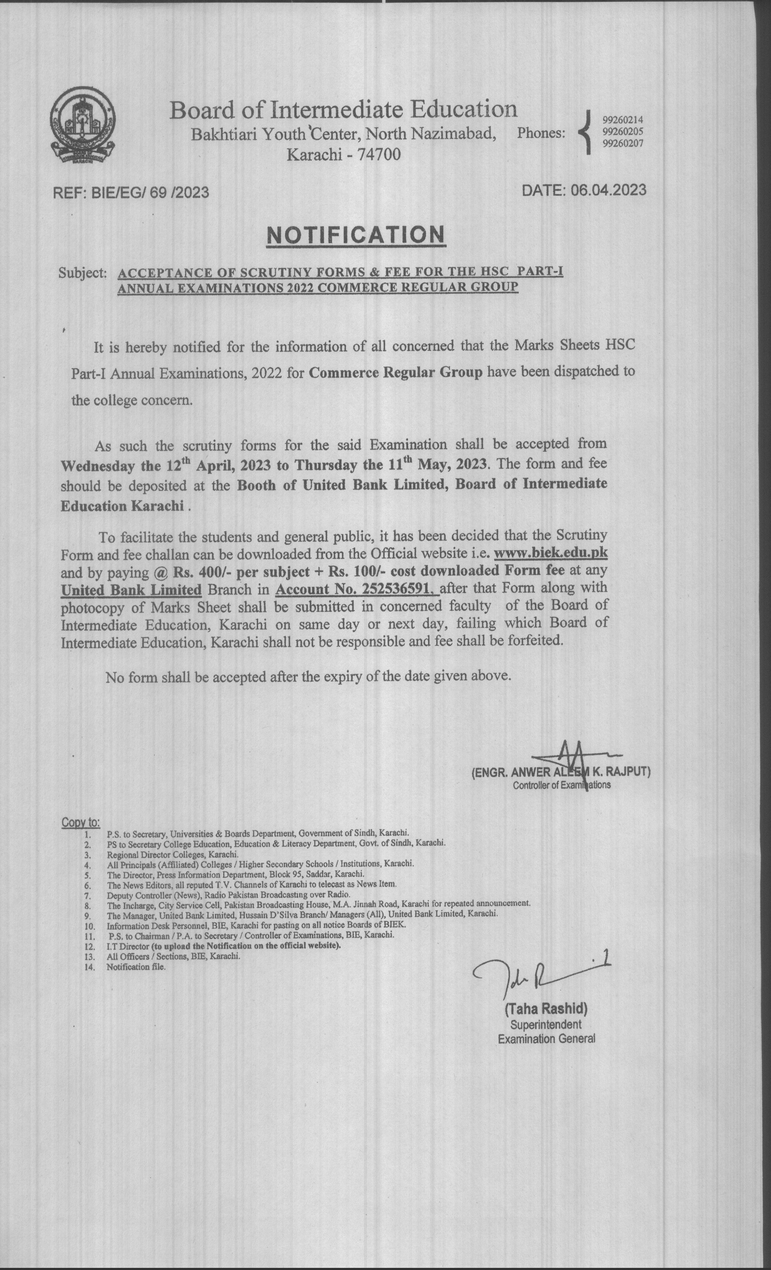 Notification regarding acceptance of Scrutiny Forms and Fee for the Sciene Pre-Engineering Part-II Annual Examinations 2024