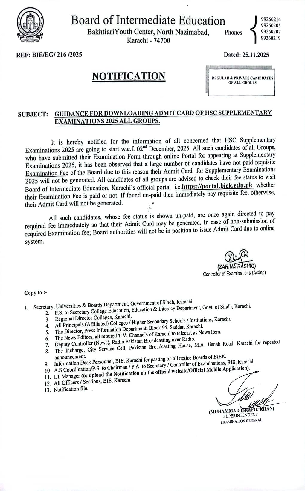 Notification regarding Guideline for Downloading Admit Card of Supplementary Examinations 2025 all Groups