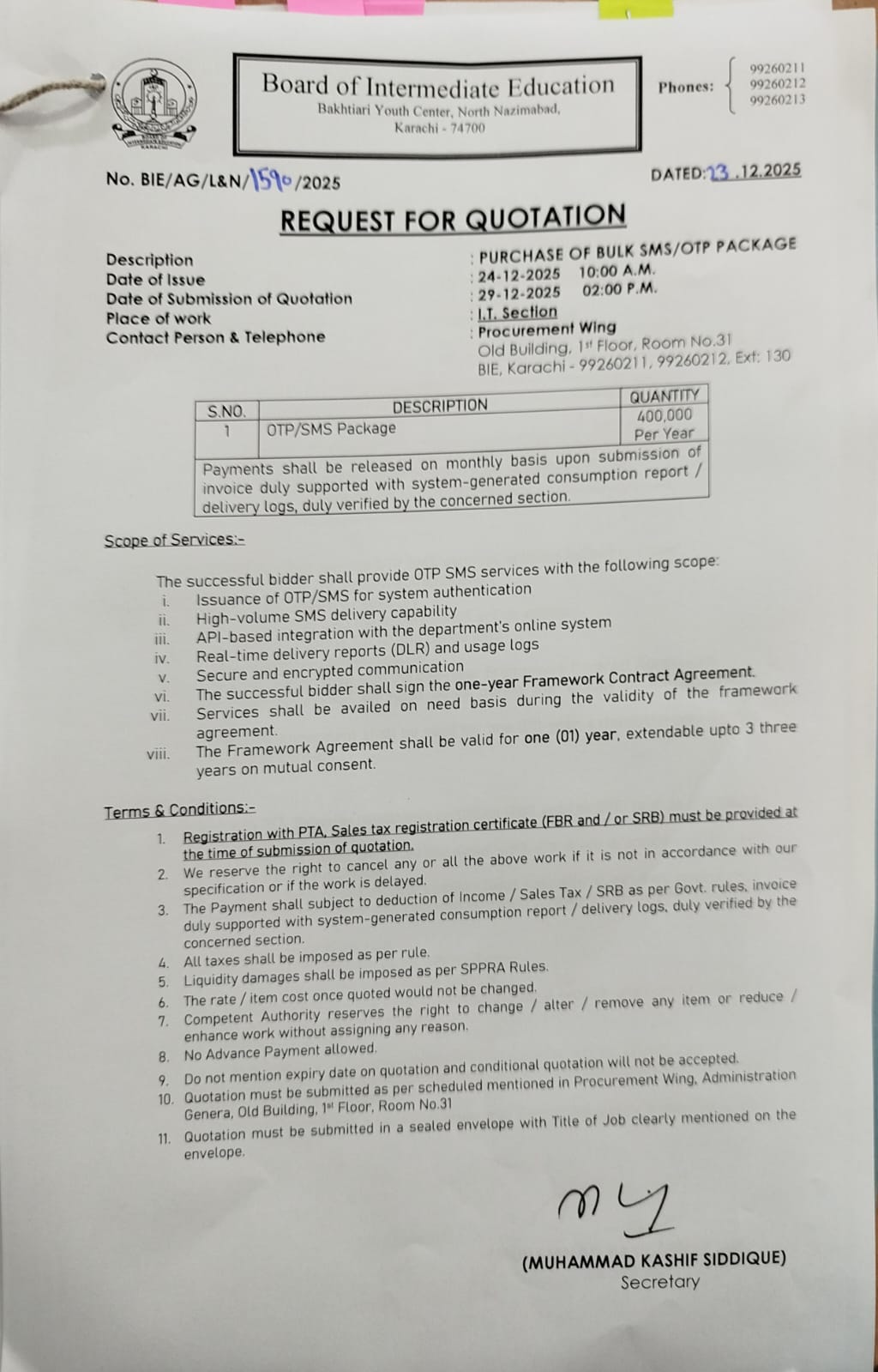 Request for Quotations for the purchase of BULK SMS/OTP Package ( 13-12-2025)